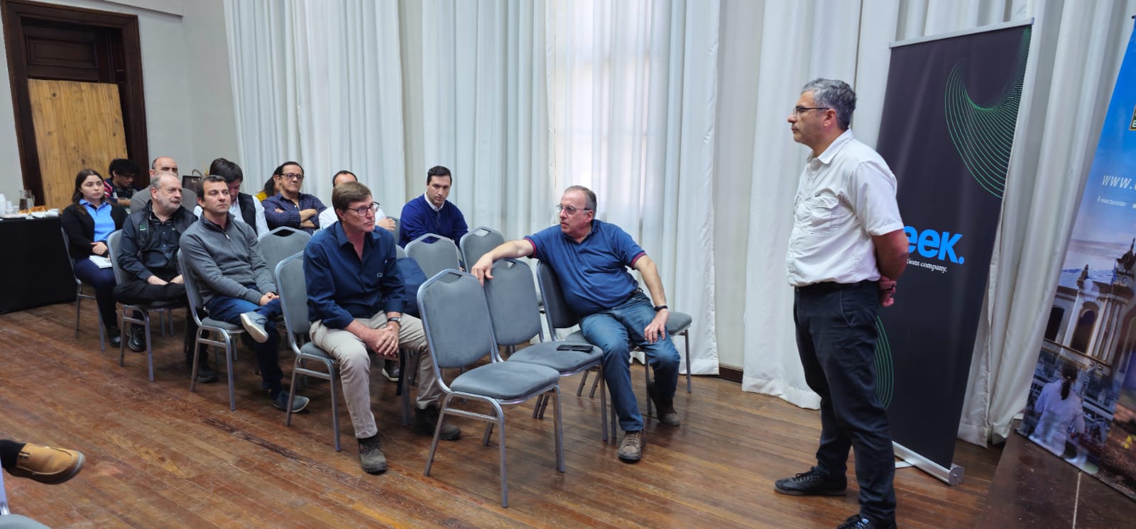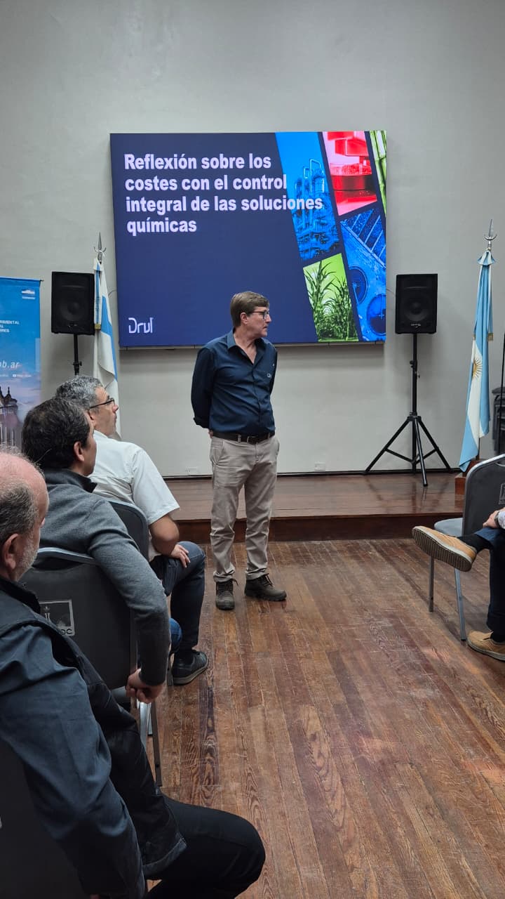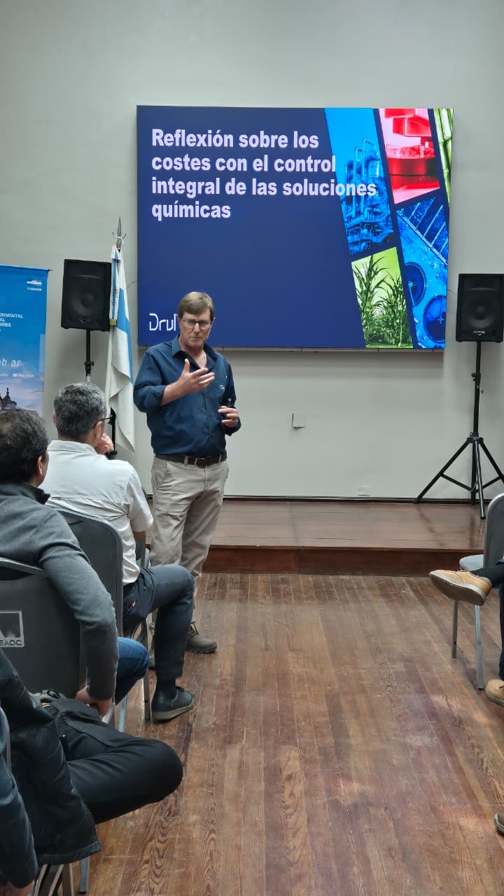 Marcelo Ruiz (EEAOC), junto con Edenilson Contrera y Paulo Mangolini (DRUL & Kleek), compartieron desarrollos y experiencias sobre control de soluciones químicas en planta, eficiencia energética con uso de biocondensados y gestión moderna de aguas, con foco en mejora continua de procesos.